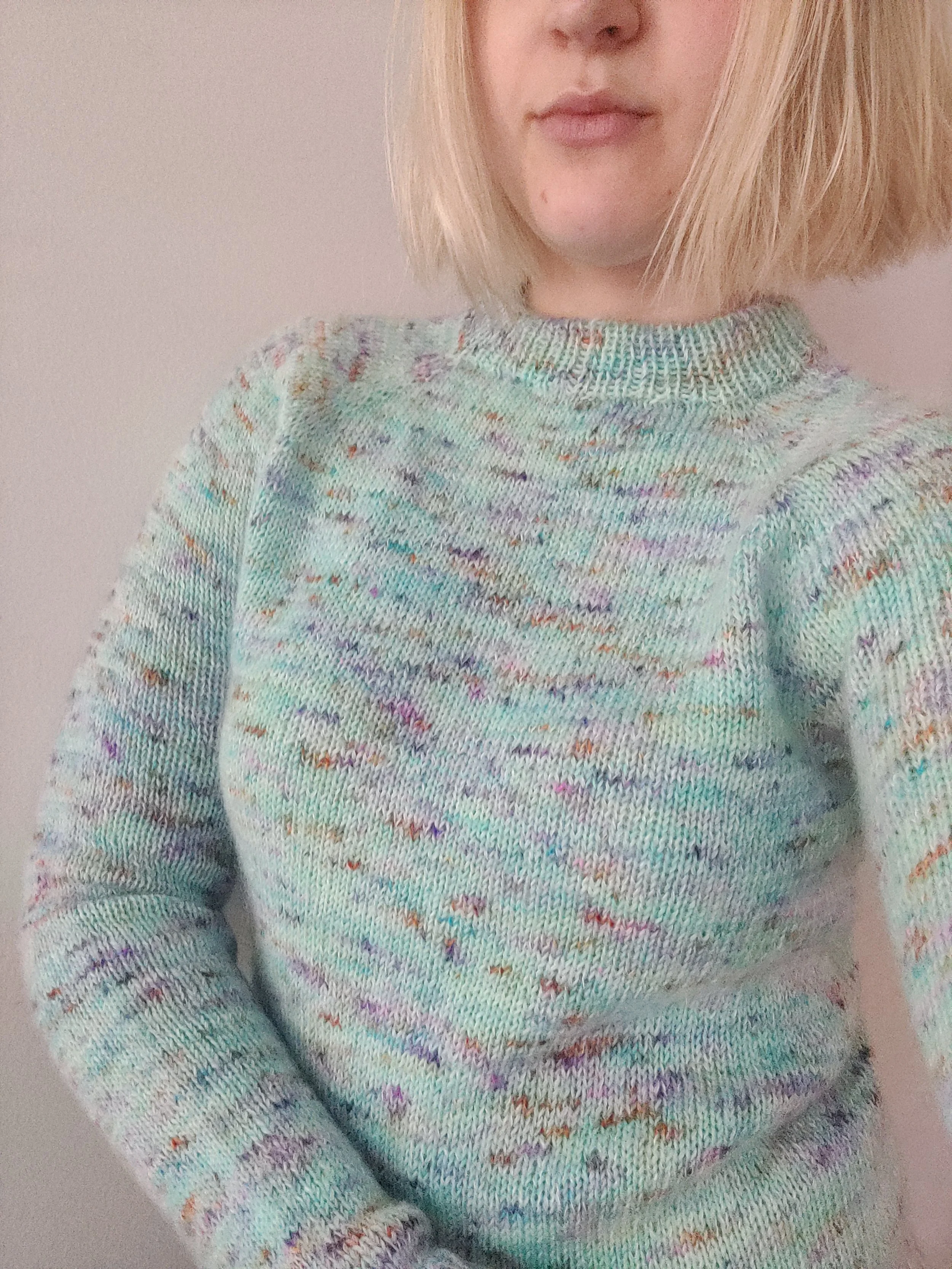 Ihanan väripläjäyksen lisäks ostin puhtaanvalkoista silkkimohairia. Aattelin, että yhdistämällä nää kaks saisin semmosen vähän utuisen turkoosin ja lopputuloksesta tuli kyl täydellinen. Mitään varsinaista ohjetta en tähän paitaan käyttäny, inspiraatiota kokoon haeskelin vähän aiemmista ohjeista, joilla oon tehnyt paitoja. Eli aika pitkälti mututuntumalla mentiin ja yllättävää kyllä, en joutunu purkamaan tätä paitaa missään vaiheessa.