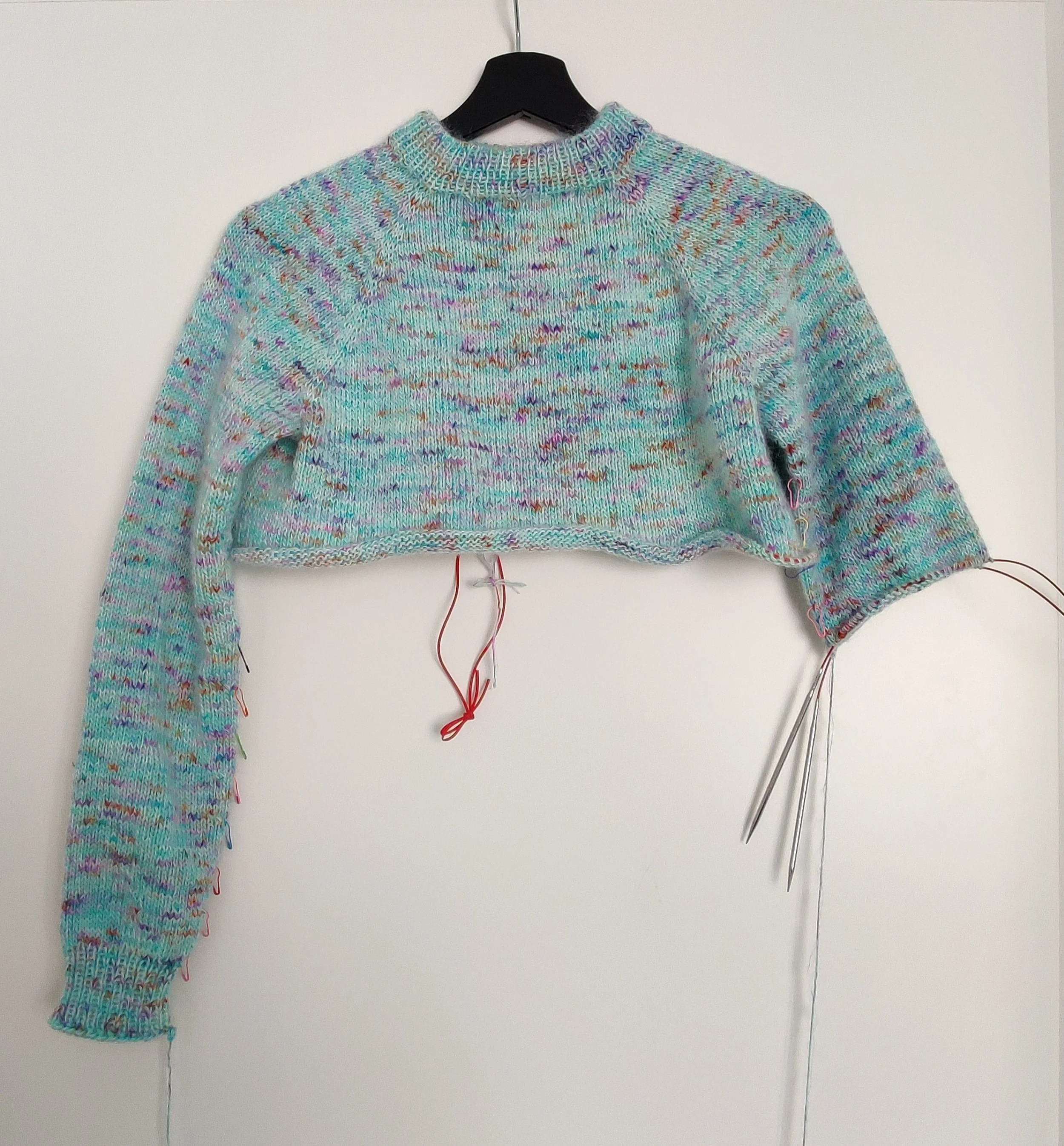 Tällaset peruspaidat tykkään tehä aika pitkälti aina samalla kaavalla: yksin- tai kaksinkertanen kaulus, raglanit, vähän vartaloa, hihat ja vikana helma loppuun. Päättelynä käytän usein joustavaa päättelyä eli esimerkiks 1 oikein 1 nurin joustinneuleessa neulon ensiks yhen silmukan oikein, sit toisen silmukan nurin ja sen jälkeen nää kaks edellistä takakautta yhteen. Tällön reunasta tulee napakka ja siisti, mut tosi joustava.